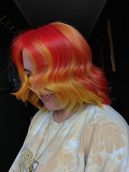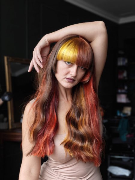 Taking colour placement to new heights, this look redefines the classic block technique with a reverse twist. A soft yet fiery palette flows from front to back, with mirrored sections that seamlessly transition across the head. To accentuate the face and ignite warmth, sunburst-yellow panels frame the features, adding that perfect golden glow. The result? A head-turning, confidence-fuelled statement that radiates heat.