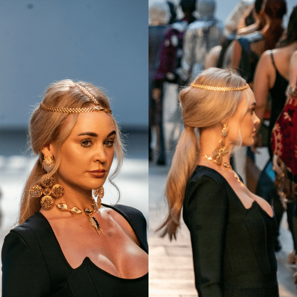 - Section the back of the hair from behind the ears and pull back into a ponytail, then secure the side sections by overlapping and folding to create a beautiful feature at the back.