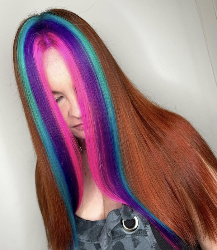 For your clients who want creativity throughout their look, flashes of colour are a great way to brighten up any style and give it a unique point of difference. Whether these colour flashes are small or large they can be tailored to each clientsβ preference. Colour flashes can be matched to any outfit or theme. Place the panels of colour throughout the hair; they can be hidden towards the bottom sections to create a highlight effect when the hair is up.