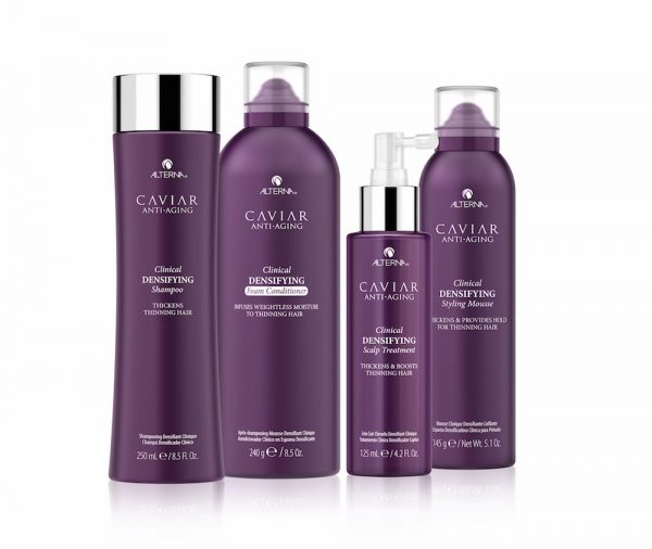 The Clinical Densifying collection, part of ALTERNA’s Caviar Anti-Aging range, is formulated with luxurious Caviar extract that is rich in Omega fatty acids, vitamins and minerals to help defend and protect against the factors that cause hair to feel and look older: physical, chemical, and natural aging. The line, which includes four products (Shampoo, Foam Conditioner, Styling Mousse and Scalp Treatment) is also formulated with Red Clover Densifying Complex to give the appearance of thicker-looking hair and is clinically proven to provide a significant boost to hair texture and thickness with regular use. The products work best for those with thinning hair and give the appearance of fuller, thicker hair.